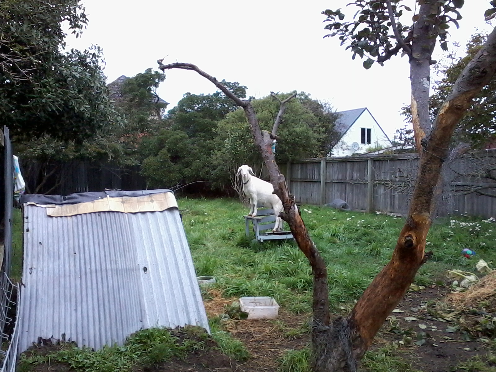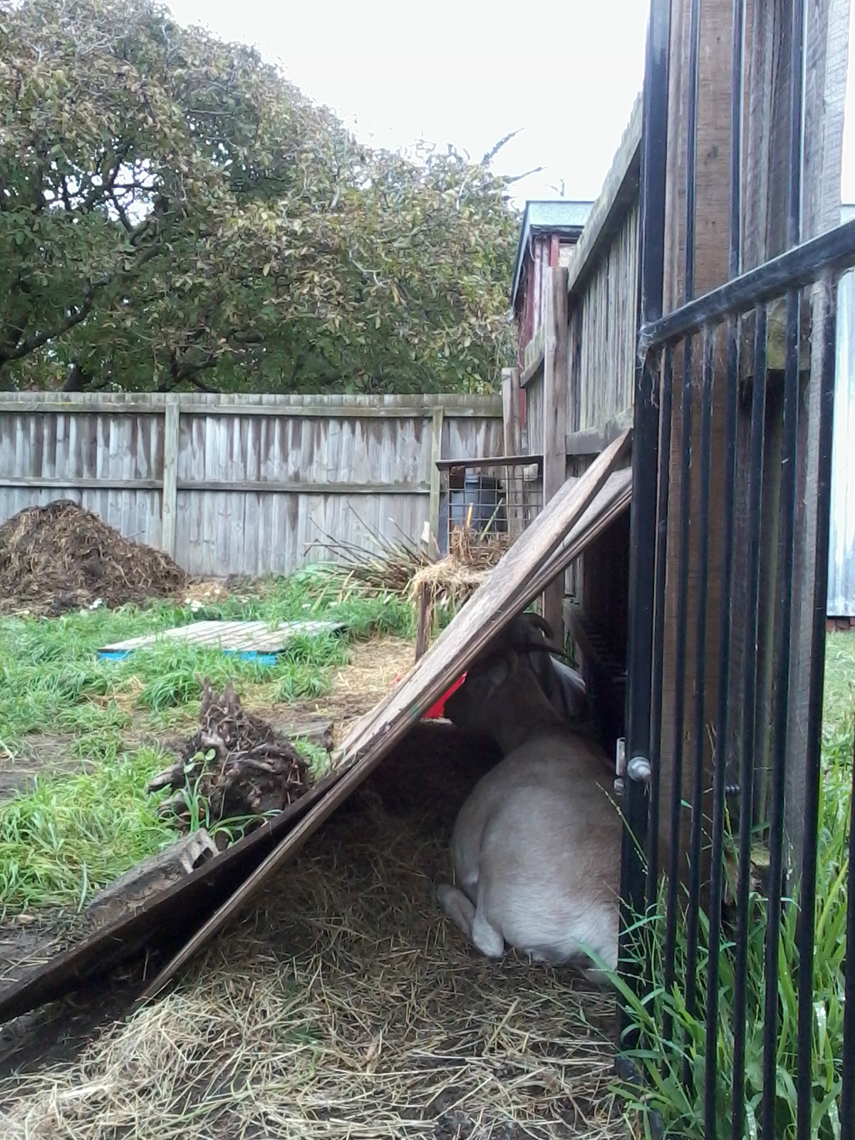 Top of the Holiday List is building a new shelter for the goat paddock. The Chalet is all very well, but the goats much prefer what we refer to as The Train: a sheet of “inherited” plywood wedged up against the paddock fence. The thoroughfare design makes for much goat merrymaking, the situation allows for uninterrupted views of the back door ensuring doleful maa’s and baa’s are well targeted, and in times of extreme inclemency in the weather department, two goats can sit back to back enjoying the combined body heat whilst turning a blind eye to home-ownership compromises. Sadly, however, scavenged hunks of plywood, whilst plentiful in post-quake Christchurch, have a definite lifespan and that utilized for The Train is no exception. It now sags quite alarmingly, causing Geraldine in particular, who is a stately goat, to adopt an unladlylike bow-legged, hunched back stance whilst entering and exiting. Plans are afoot, timber has been sourced, and we have lots of long nails and binder twine (essentials to any Homestead build) to hand. Now we just need it to stop raining.