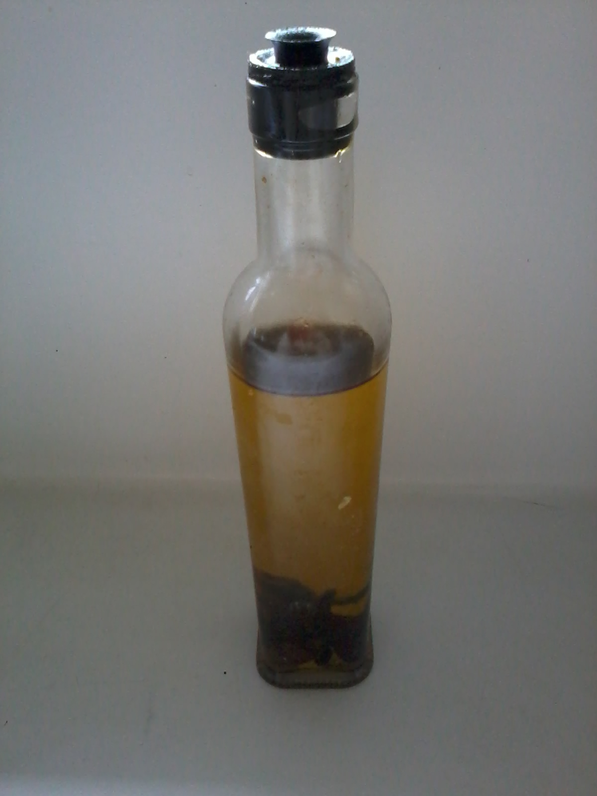 Good quality olive oil, gently infused by bunging in a chopped chilli and a garlic clove. How exotic!
