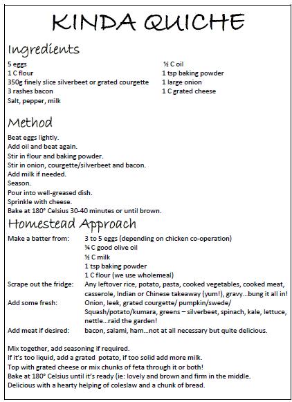 Hey, didja know that you can make this sweet too? Yep, sweet quiche. it’s not bad I must say. Subs out the savouries, add a little sugar and chuck in sweet bits. It’s almost a baked custard but not quite. Not that sweet leftovers last very long in our house so don’t reckon I could incorporate that in any way but still, just another awesome use for the humble chook pellet. 😉