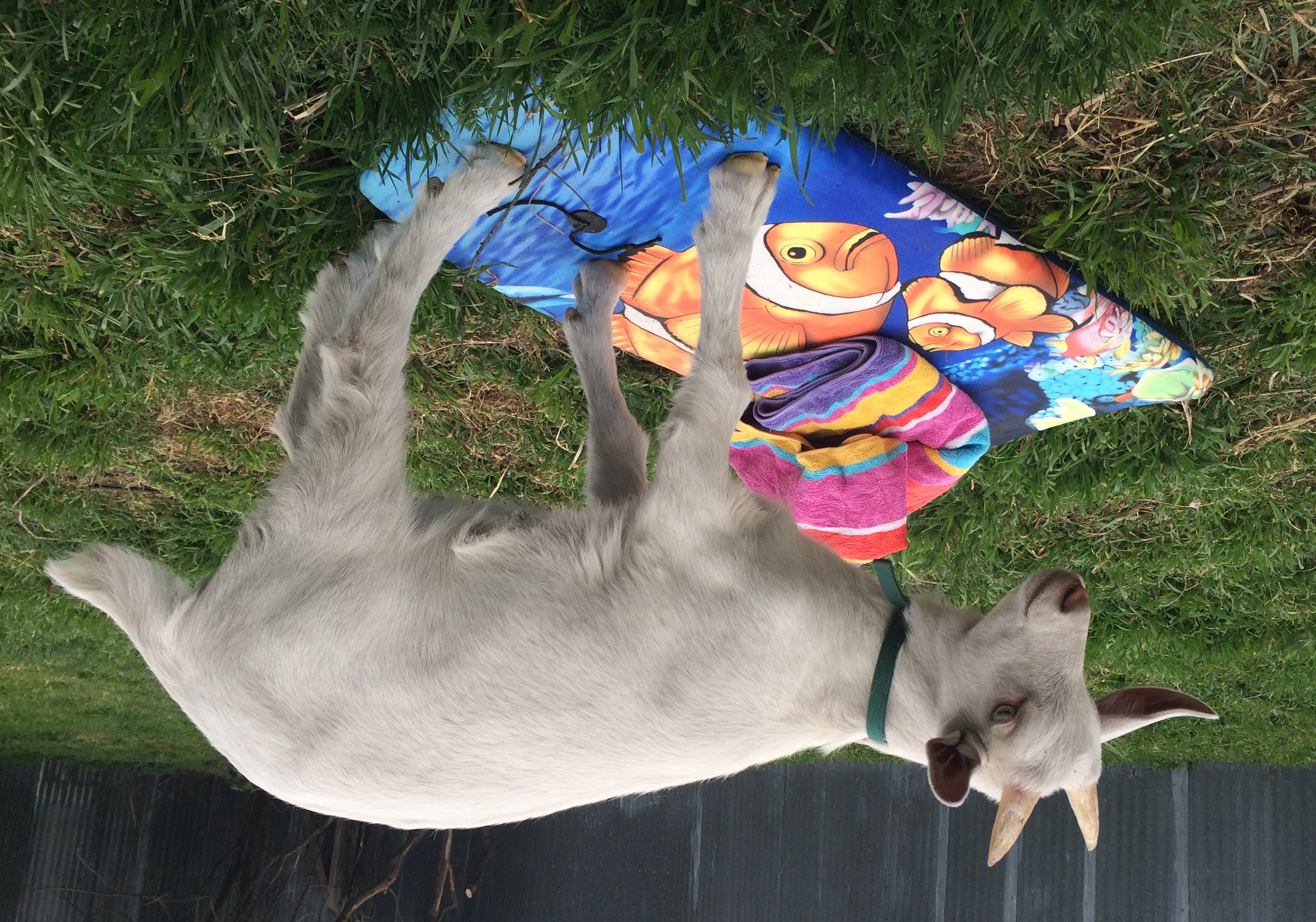 Photographic evidence of what actually “floats our goats”. Otis, playing along for the camera, has no idea what the hilarity is about, but he has an inkling that towel may be edible.