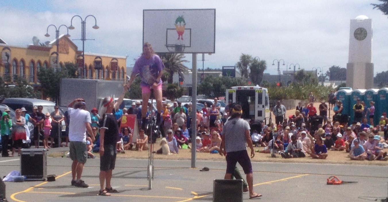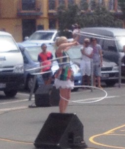 This was just a fleeting peek, however, as we headed off to watch the Homestead favourite busker: MulletMan, and the following act, Hula Queen (experience has taught us that sitting on the concrete steps in the noonday sun for any longer is a recipe for disaster).  MulletMan is Christchurch’s local boy made good. Yep, we’ve seen the show before but the funny bits are still funny, the clever bits still clever, and it’s always fascinating to see the stuff that isn’t either of those two but still gets the laughs. Even though the wind (so essential for the kites) blew his fire-torch out, he still juggled that, a machete and a spanner whilst seated atop a very tall unicycle – and we loved him for it.