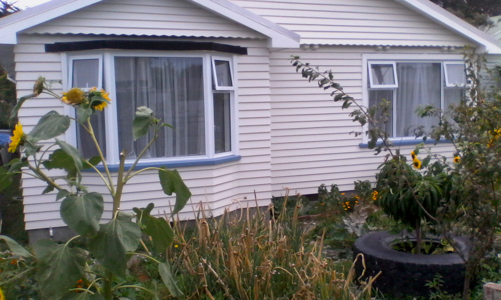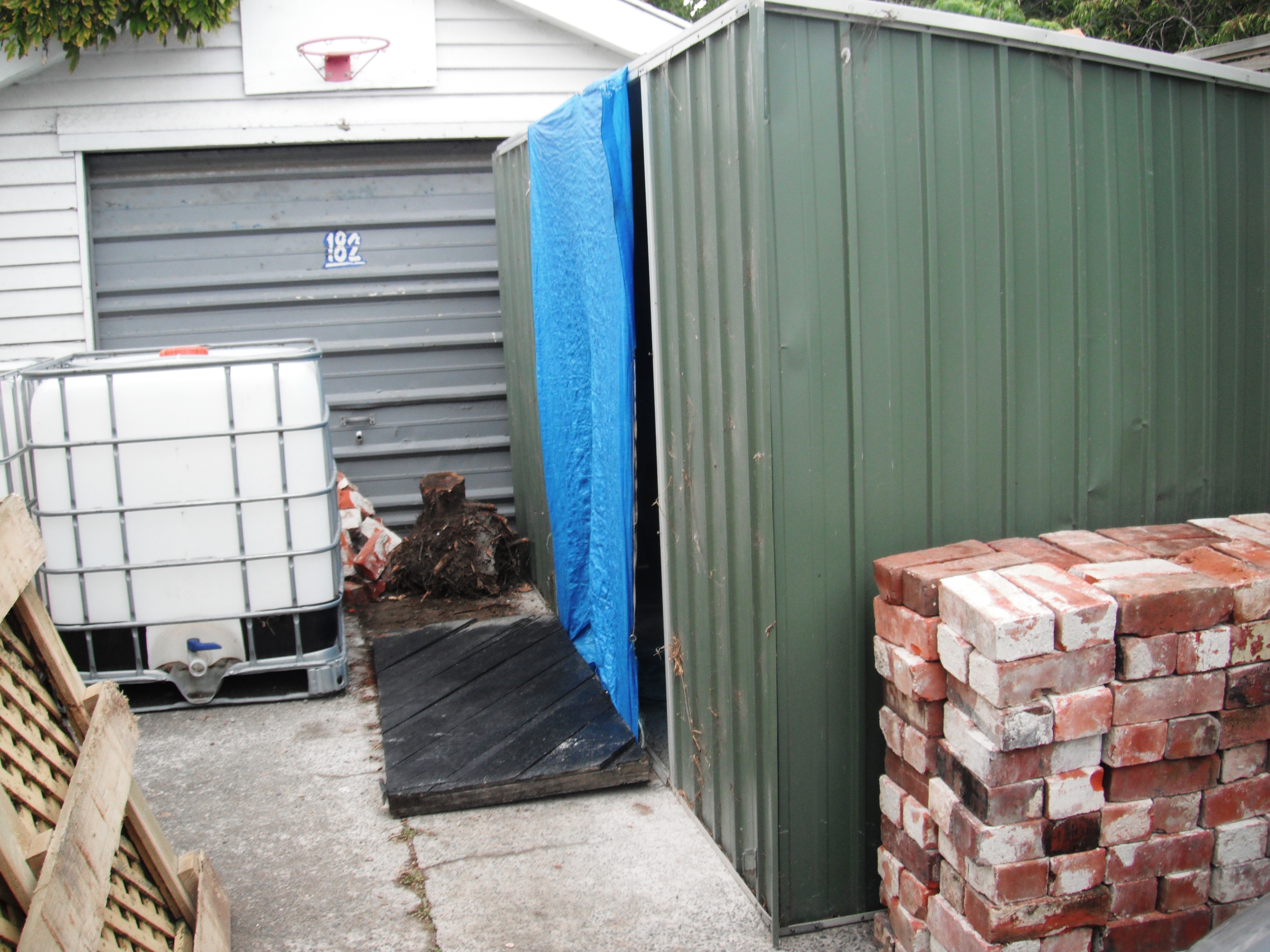 The garage is indeed a garage although it’s never been used for the housing of vehicles on account of its ricketyness. when we first moved in, we fixed the front tilt door you can see in the photo and entered through that, however it weighs a ton and after the quakes the engineer in the family did a few equations that suggested that the door serves a better purpose as providing structural support until we get it empty enough to demolish it. Hmmm…as fast as we empty it, we refill it and building regs have changed so much with regards to foundations that to rebuild is now way out of our price range. The current plan is to demolish, utilise the land and build a car port…either way, the door is never opened.