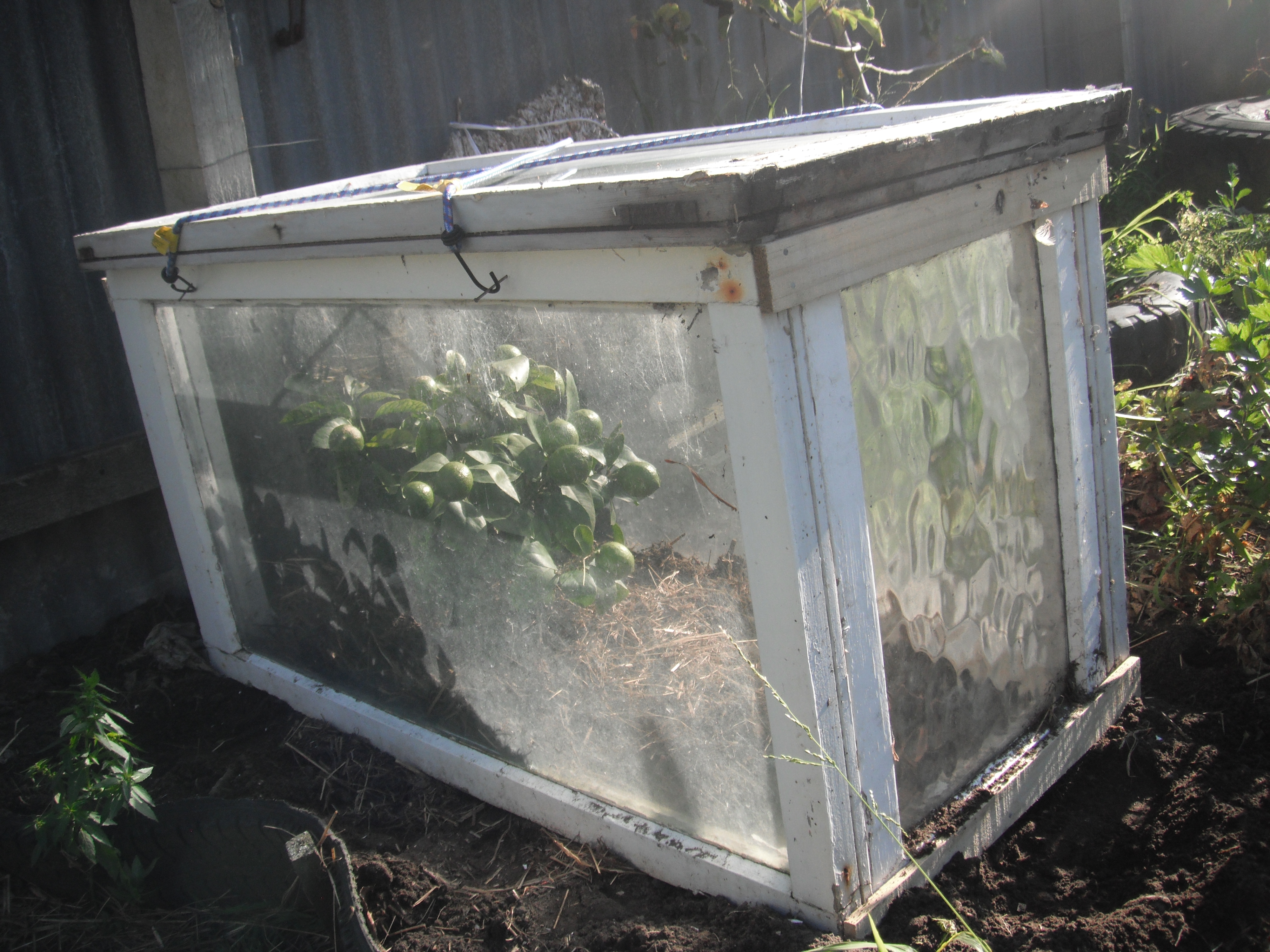 With the promise of frost in the air and the barometer backing this up, first on this week’s list was to construct a winter abode for the lemon tree. Whilst last years umbrella and bindertwine construction did the job, The Goat Herd/Chief Engineer has been keen to utilise some of the old Homestead windows.