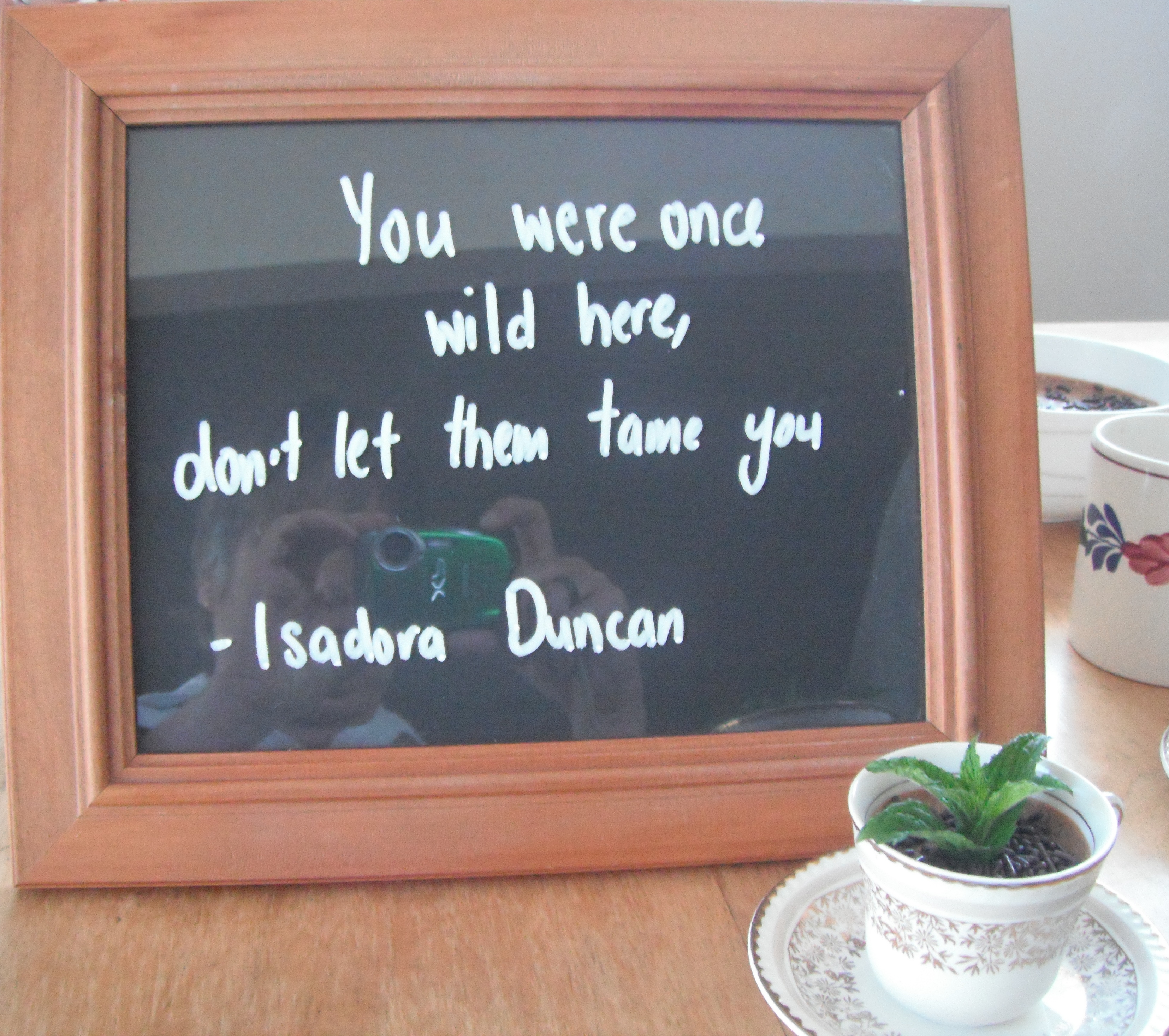 What a great photo and a lovely quote! How clever to match the green in the cup with the camera! And I love reading the story about Isadora…always surprises fromt he Union Homestead! xo Johanna