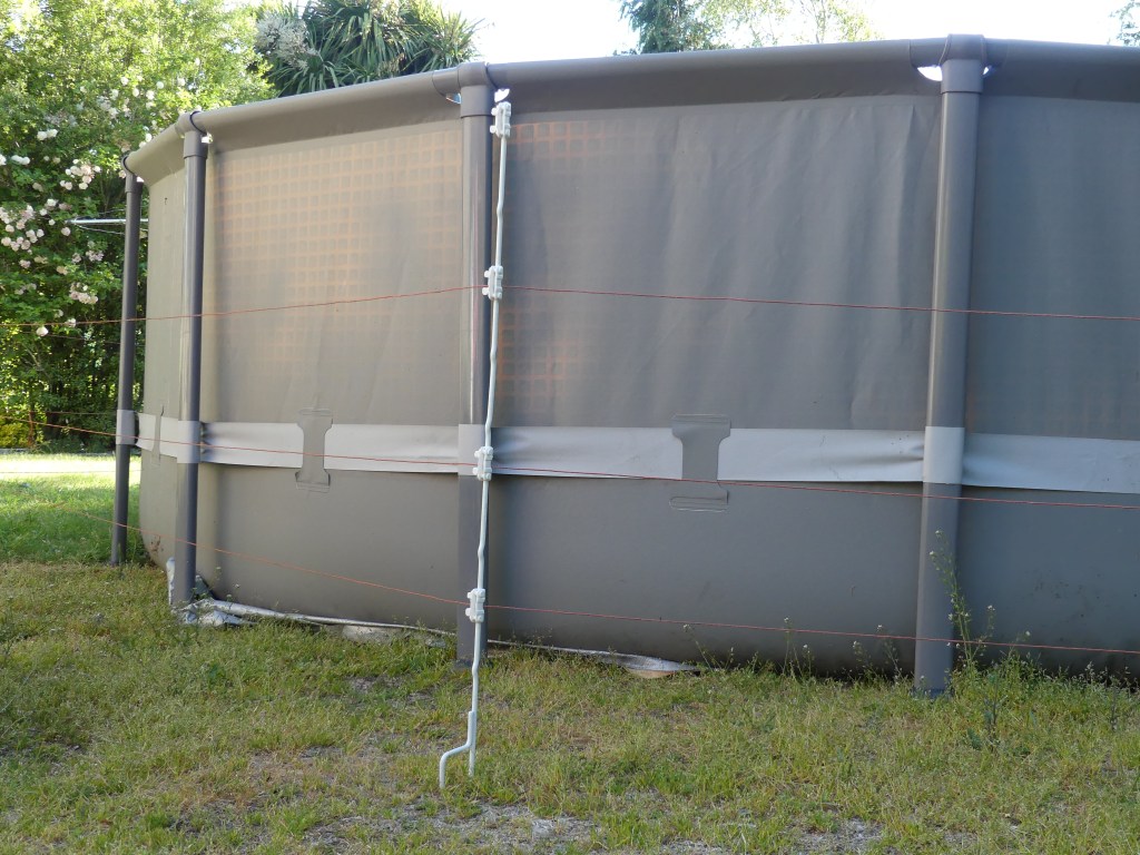 Over the weekend, we unfolded, assembled, and began filling the only pool I know of that is surrounded by an electric fence (to prevent scrabbly pawed puppy damage). Now, for those of us (pick me) who treat electricity like voodoo, I was a tad unhappy with the whole zappy-zap/water mix but those in the know (The Resident Engineer and Bean Counter) scoffed at my concern and went into boring scenarios involving solid sheets of water, great lengths of fencing, and my happiness to negotiate those fences we have around the place during downpours. I know when I’m beaten – as does Colin, who now gives the pool a wide berth.