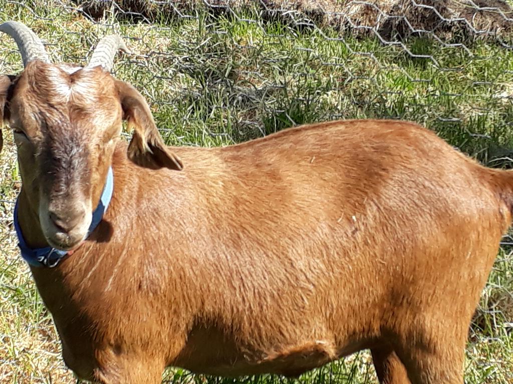 Over in the goats paddock, Sandra, after frantically fighting its application, is now very proud to pose with her new, blue collar.