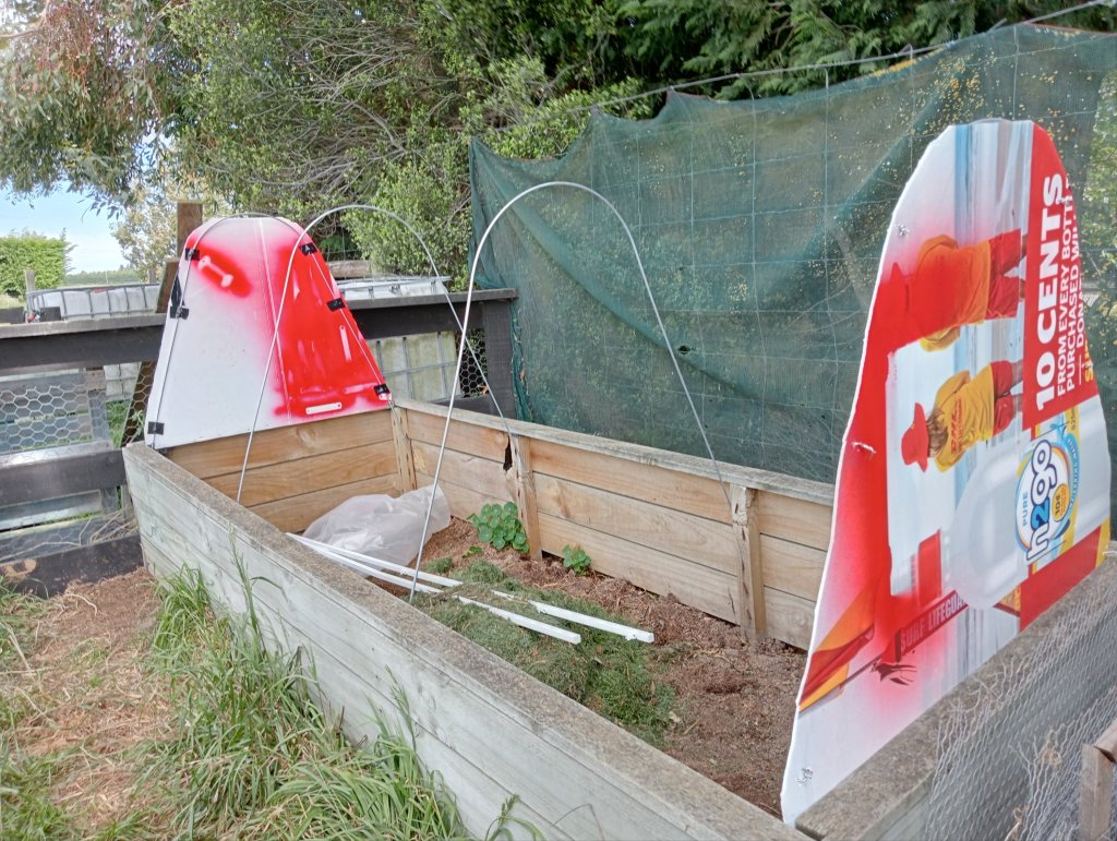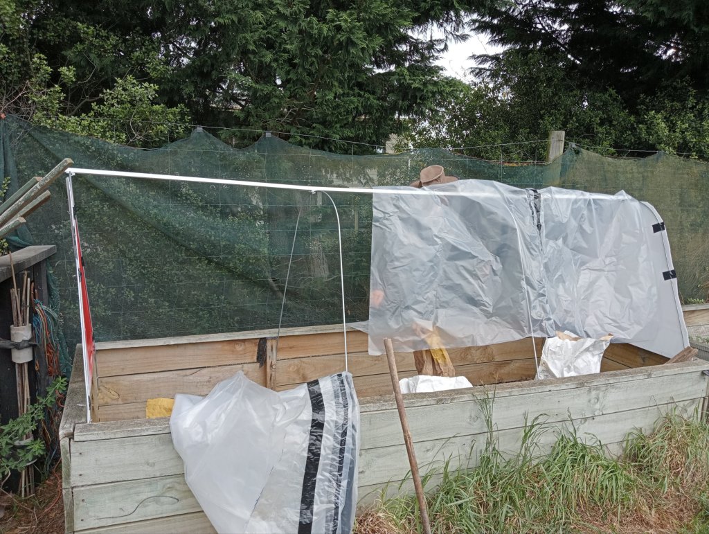 I had also earmarked my grandiosely named Tunnel House Project as requiring a bit of his two-head-are-better-that-one/many-hands-make-light-work attention. Part of clearing out the duck enclosure to make way for the Tiny Housers was relocating a couple of large raised beds to the vegetable garden. Thus my dreaming began. Funds and priorities restrict us acquiring either a tunnel or glass house at the moment but y’all know I love nothing more than making summat from nowt. So far the skeleton we’ve constructed from wire and bits of a repurposed shelf, has stood up to some pretty intense gales. We’re just waiting for the weather to abate a bit so we can affix the gleaned polythene, cut and duct taped together, and tomato planting can commence.