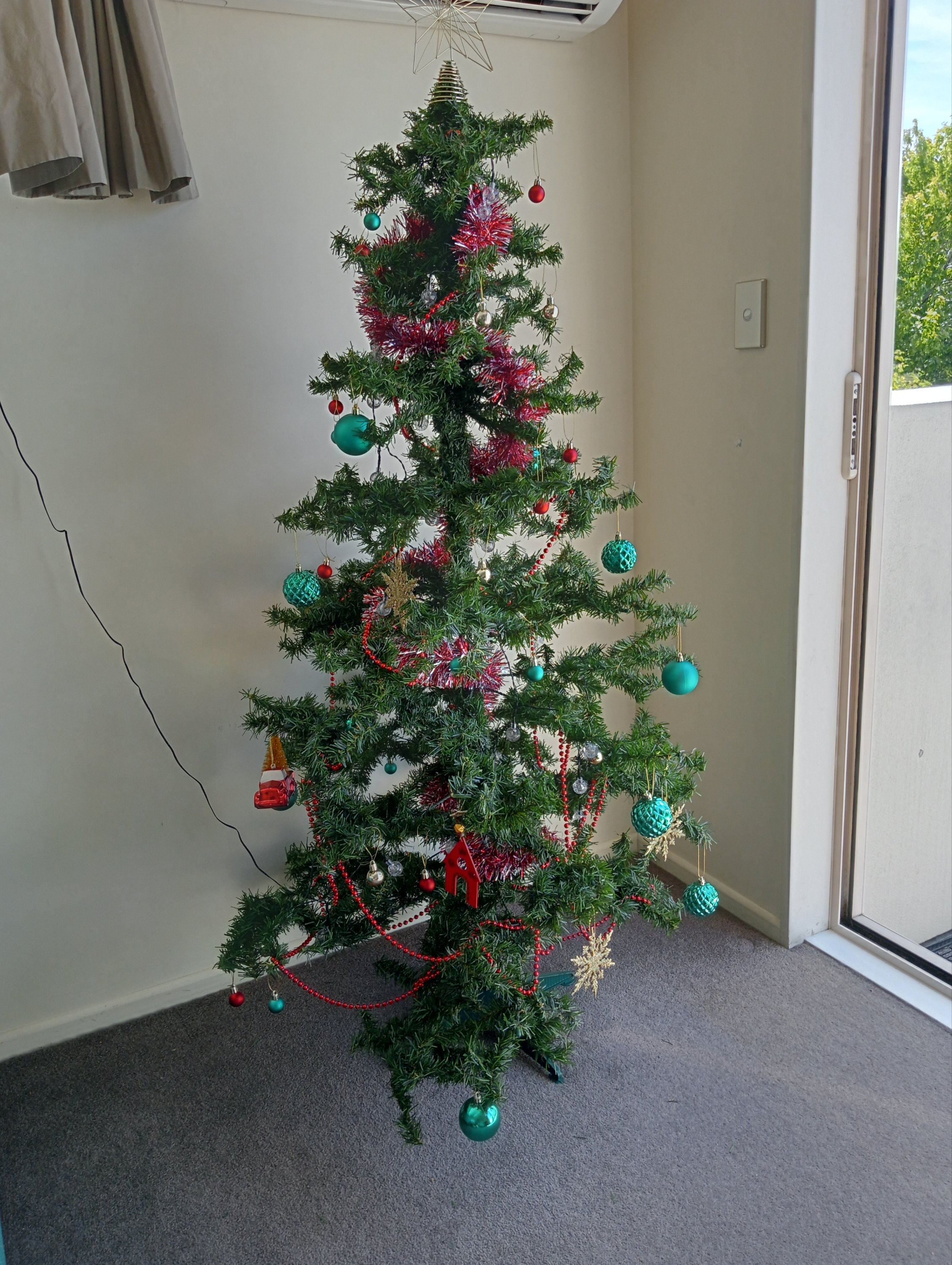 At the Union Homestead Urban Outpost the tree is up, Colin approved when he, like Santa, came to town, and photographic evidence that The Engineer was right – the spare room would fit a double bed.