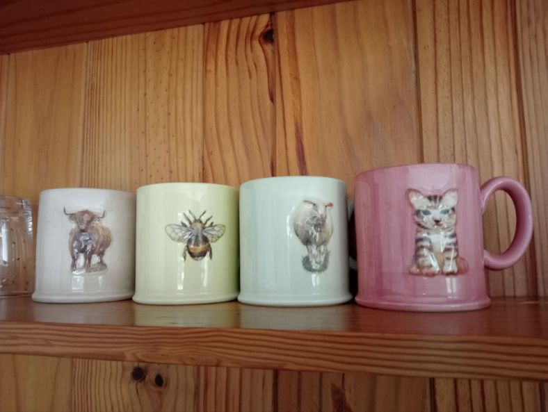 Like these cups, a gift from the Tiny Housers. I love them – and not just because they have a stonking capacity. The cup’s subjects, reminiscent of the Homestead menagerie, all have attitude!