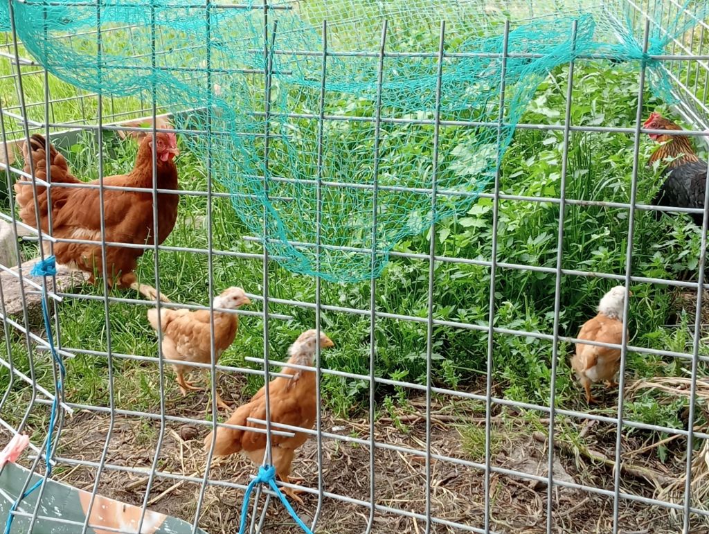 And with an eye to future abundances, our chicks continue to grow in both size and chickeny knowledge, well taught by their two over-indulgent mothers.