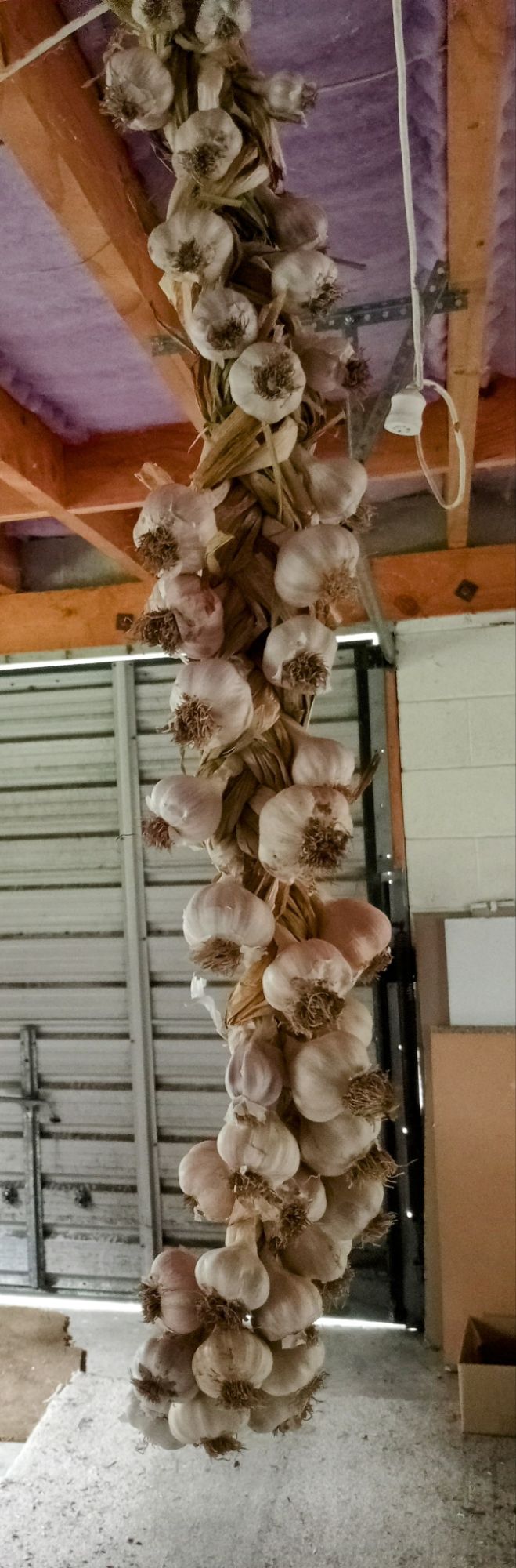 This year’s garlic harvest in place while Marilyn enjoyed the remnants of last year’s