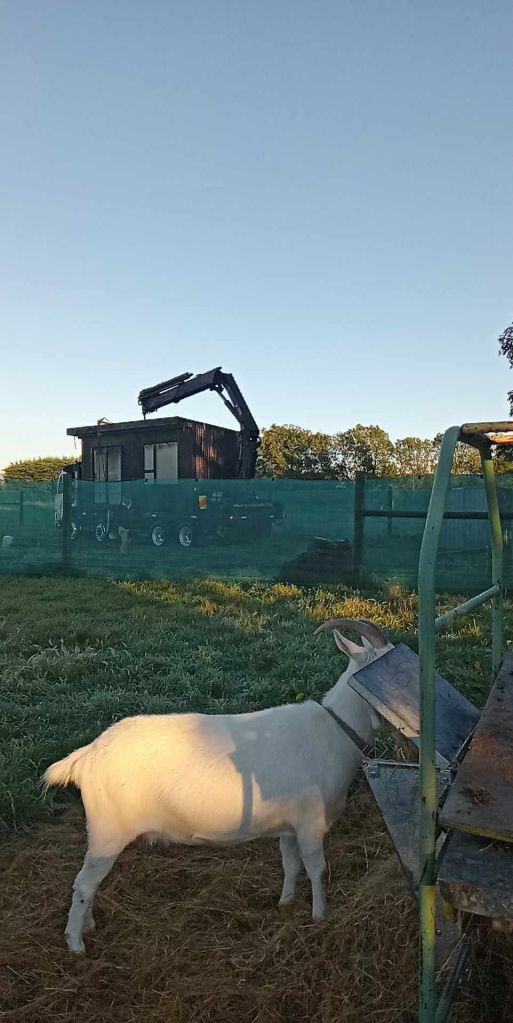 Ben the Builder had asked that we move or tie up the goats as they needed to leave the gate open to aide in Hiab maneuvering, but in the end all that was required was double hay rations as Marilyn so aptly illustrates. I, of course, was required to supervise the untethered goats…my lurking in the goat paddock had nothing to do with my excitement about the big truck and flashing lights.
