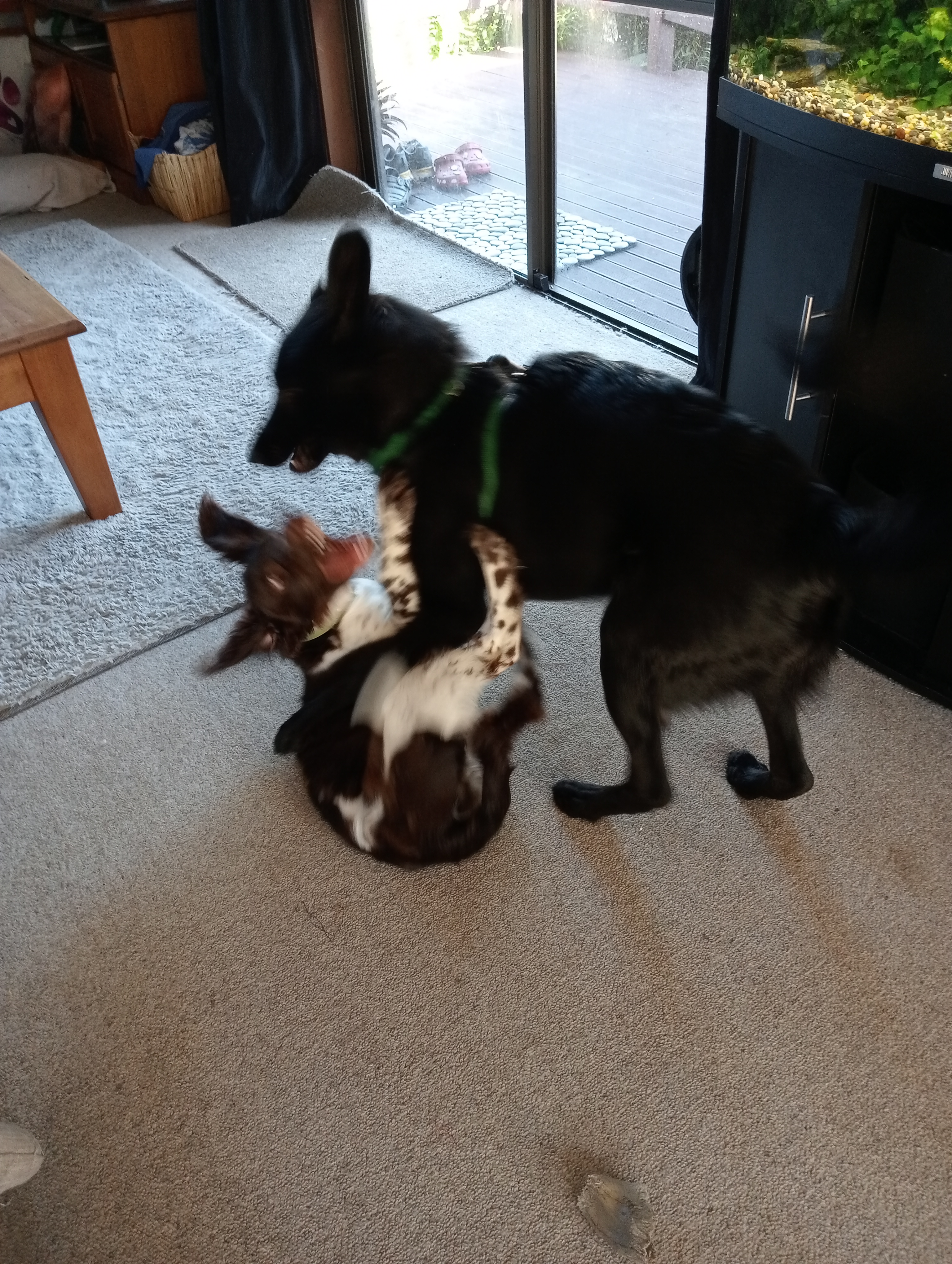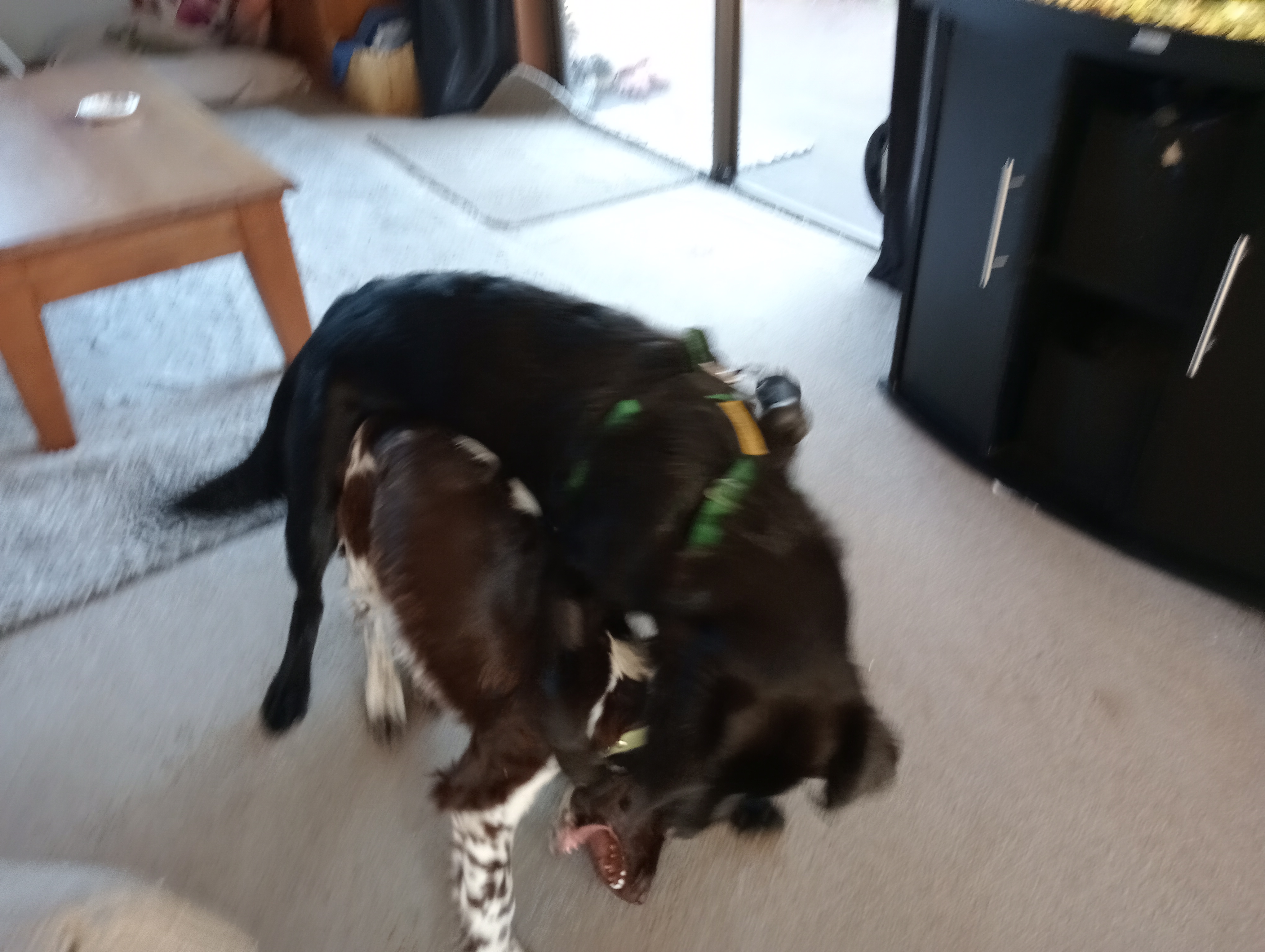 Having been administered some magical anti-inflammatory medication, Shirley was full of beans on her return and keen to show off her battle scar. Colin even managed to get a tug-of-war game up and running, something she’d not displayed any interest in of late