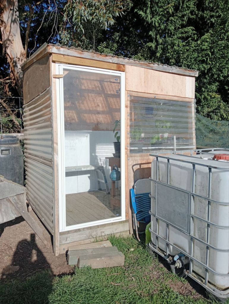 A few more salvaged bits (I just knew that shower door would come in handy one day) and lots of long nails and bindertwine (the Homestead go-to assembly method) and we present to you