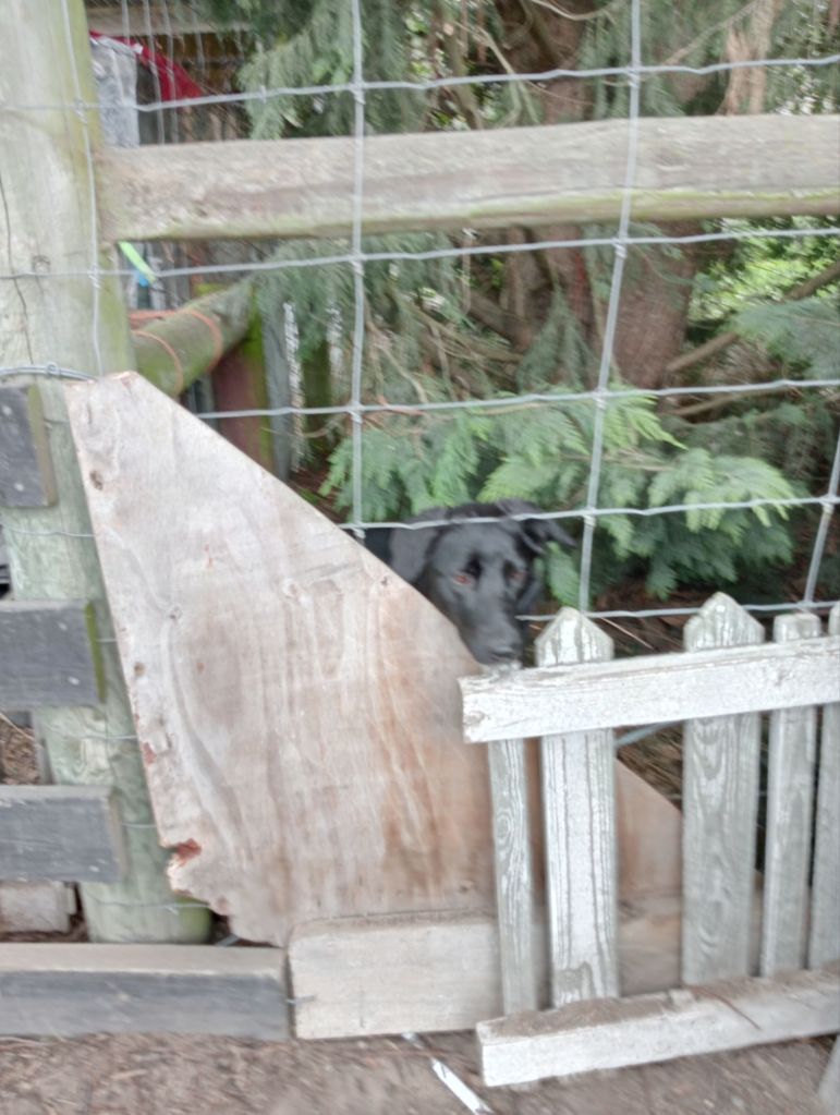 Shirley, resting her chin on the hastily patched together and now redundant fence (designed to keep her puppy self away from last year’s gambolling lambs) while she watches the lambs playing and the coop resident’s joy when some more compost is added to the bin never fail to make me grin