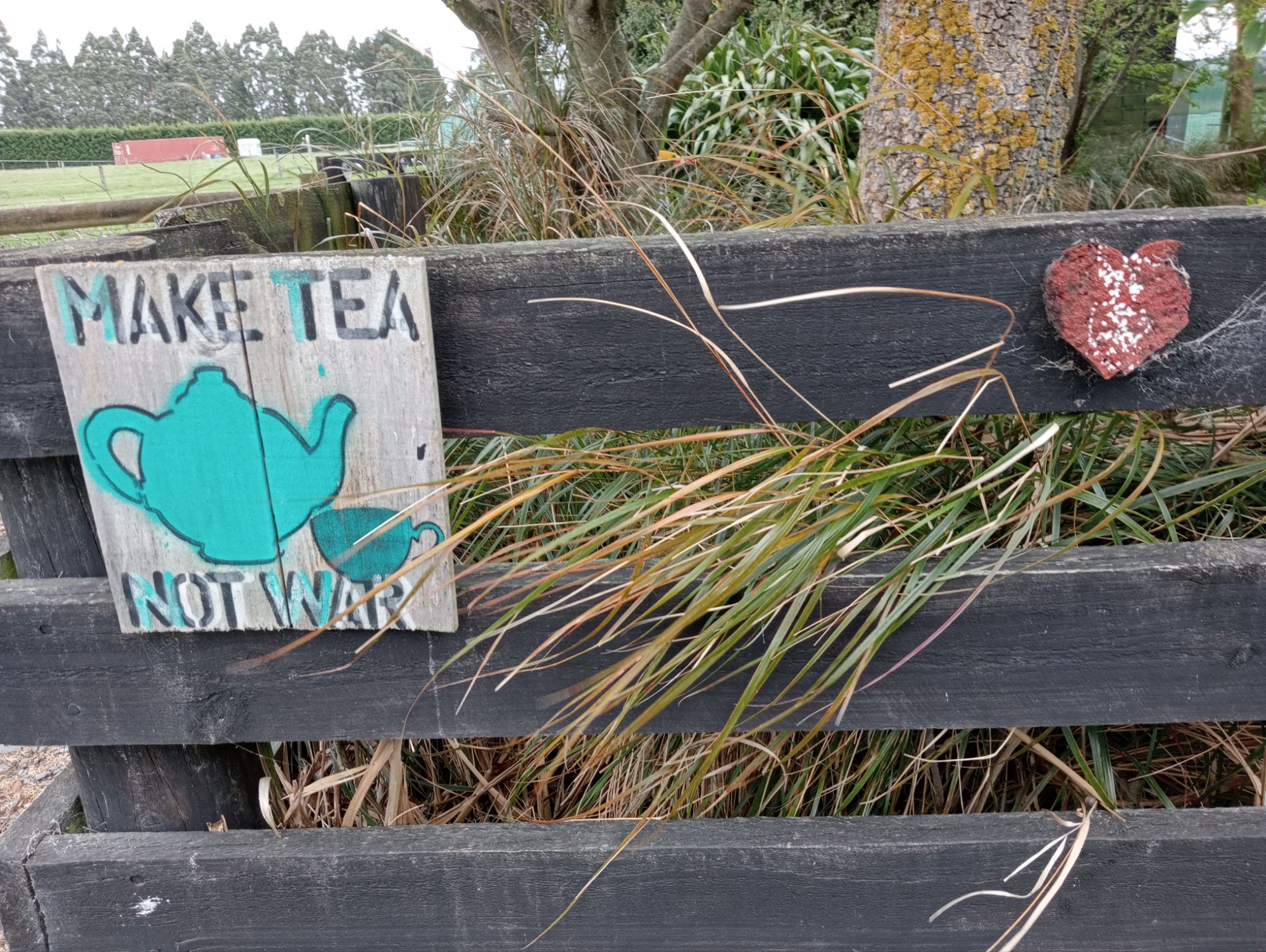 while my driveway fence art (the heart is part of the running track from Queen Elizabeth II Stadium, built for the 1974 Commonwealth Games and trashed in the 2011 earthquake; we bought it at a fundraiser and that it is lopsided because puppy Colin got hold of it makes it even more precious) always gives me great joy and that the wind is blowing only enough to make the trees whisper is something, at this time of the year when the gales howl, to celebrate.