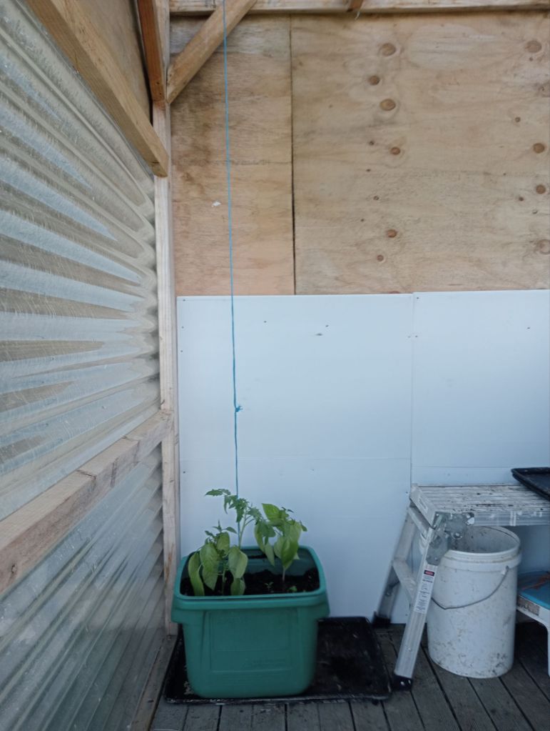 After lunch – again requiring a mighty effort – The Bean Counter, who has the day off today, and I toddled down to Farmlands to replenish the feed bins and, in the process, discovered their shareholder card partner, Bunnings, had set up camp in the carpark and so we came away with all the required feed plus a couple of T Shirts, branded socks, and a sausage in a bun each. Thusly fuelled, I managed transplant a tomato and a couple of companions in the glasshouse.