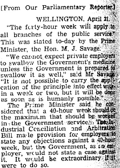 The eight hour day was never actually passed into law; it just generally became accepted as the norm until the Industrial Conciliation and Arbitration Amendment Act 1936 made the 40 hour week standard for all except shop workers who still had to work half day Saturday until 1945.