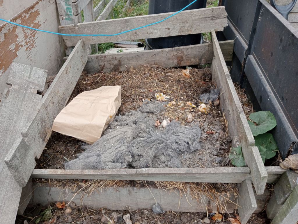 My humble composting set up ain’t fancy. It starts with a haphazard pile of everything from vacuum bag detritus to vegetable scraps and hidden-nest eggs. Then it’s over to the chickos with their scrtich-scratch agitation action.. All I need do is shovel the contents from bin to bin on a fairly regular basis.